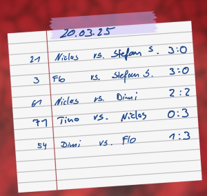 Drittes Spiel des Abends für Niclas – und erneut eine starke Leistung. Tino, der nach seiner Verletzung wieder fit ist, war ein ernstzunehmender Gegner. Zwar konnte Niclas nicht ganz an seine vorherige Scoring-Power anknüpfen, spielte aber clever und kontrolliert von vorne weg. Tino hatte starke Aufnahmen, kam jedoch etwas zu spät ins Spiel. Das 3:0 für Niclas katapultierte ihn direkt in die obere Tabellenhälfte – ein sensationeller Abend für ihn!