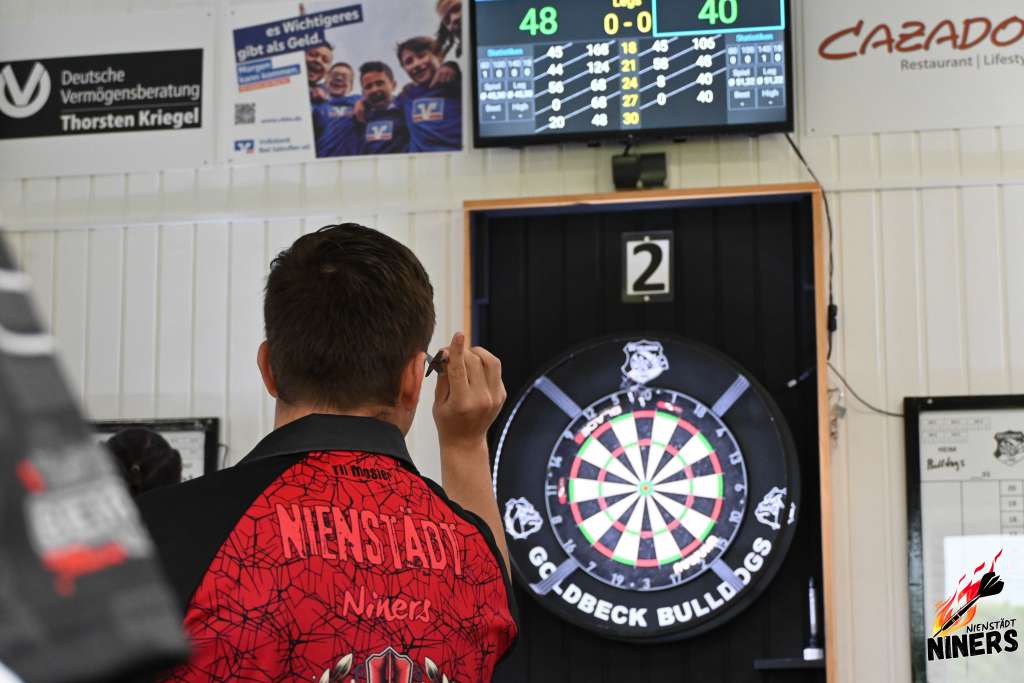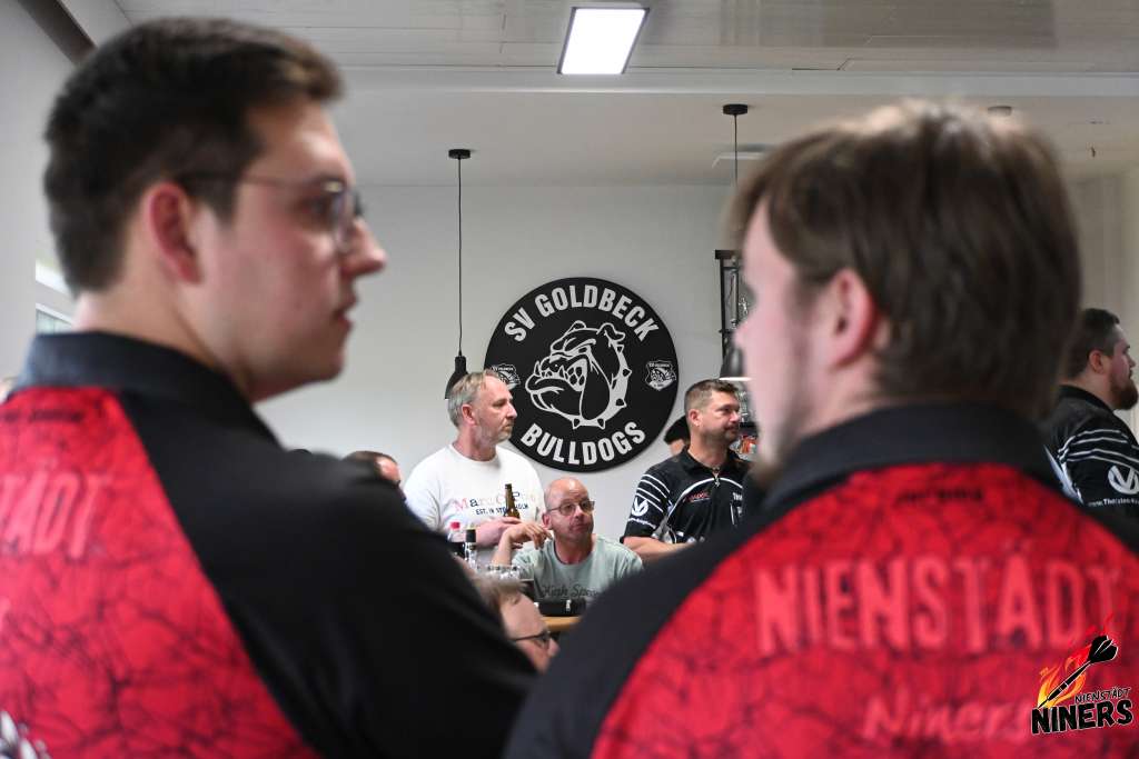 Das Vereinsheim der Bulldogs war bis auf den letzten Platz gefüllt. Die Luft vibrierte vor Erwartung. „Es ist ein unbeschreibliches Gefühl, vor so vielen Zuschauern und Dartsliebhabern spielen zu dürfen“, sagten die Niners voller Stolz. Man sah es in ihren Gesichtern, spürte es in ihren Stimmen – heute wollten sie zeigen, was in ihnen steckt. Bevor es ernst wurde, sammelte Teamcaptain David seine Spieler zu einer letzten Ansprache. „Egal, was kommt – wir kämpfen zusammen, wir halten zusammen.“ Spartenleiter Sven gab allen noch mit auf den Weg: „Vergesst nie, warum wir hier stehen: Weil wir diesen Sport lieben.“