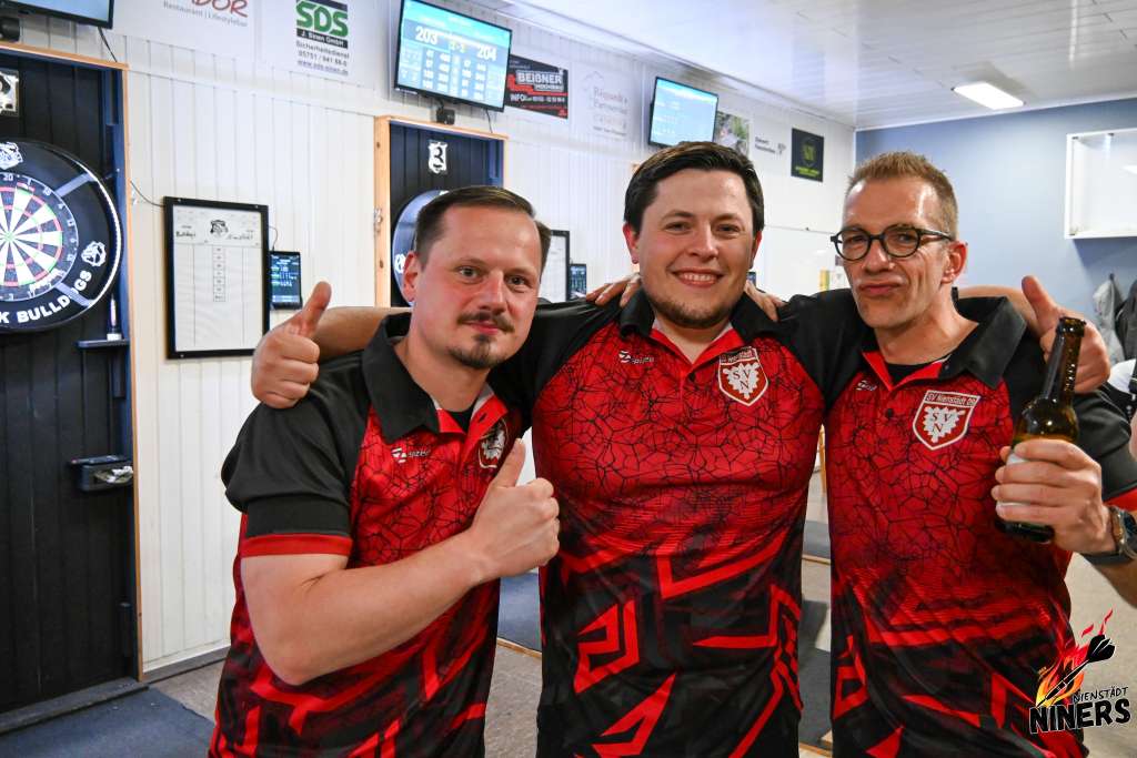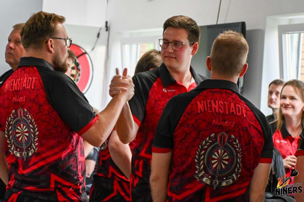 Dimi und Til gingen ans Oche. Beide spielten mit Herz, mit Leidenschaft, mit Nervenstärke. Jeder Dart war ein Statement. Als Til schließlich den Dart ins Doppel setzte, der nicht nur den Punkt, sondern den Aufstieg sicherte, brachen alle Dämme. Jubel, Tränen, Umarmungen – die Halle stand Kopf. Die Niners lagen sich in den Armen, schrien ihre Freude heraus. Es war geschafft!