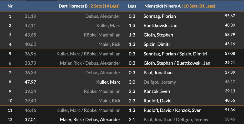 Die letzten Doppel verliefen ausgeglichen. Sven und David spielten ein starkes Match mit einem Average über 50 und gewannen 3:1. Jey und Joni mussten sich hingegen geschlagen geben. Damit stand ein Endergebnis von 10:2 für die Niners fest, die damit ihre Ambitionen in der Liga weiter untermauern.